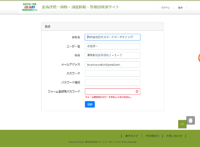 (フォーム登録用パスワードが一致しないと、ユーザー登録ができない)